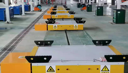 生产线可水平循环布置,也可垂直分层布置,适应各种场地条件。各工位生产节拍不要求严格同步,具有一定柔性与缓冲能力,智能化牵引,可节约人力和时间成本,具有灵活的可调节性。